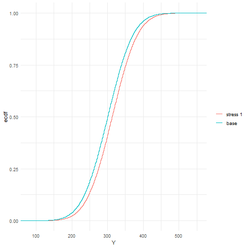 Beyond considering the standard statistics evaluated via the summary function, stressed probability distributions can be plotted. In the next figure we show the impact of the stress on the cumulative distribution functions (cdf) of Z1 and Y. It is seen how the stressed cdfs are lower than the original (baseline) ones. Loosely speaking, this demonstrates that the stress has increased (in a stochastic sense) both random variables Z1 and Y. While the stress was on Z1, the impact on the distribution of the portfolio Y is clearly visible.