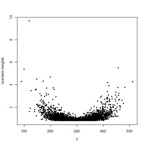 plot(Y[1:5000], w.sd[1:5000], pch = 20, xlab = "Y", ylab = "scenario weights")