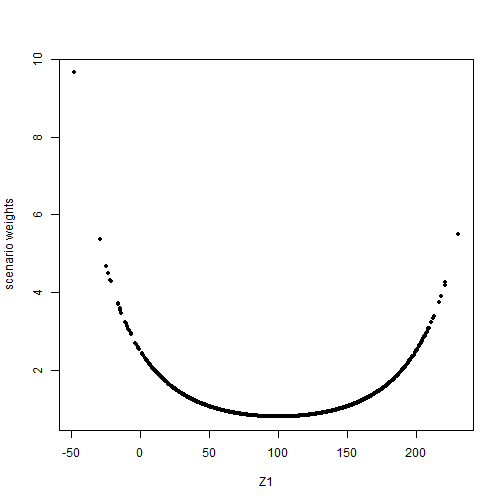 plot_cdf(str.sd, xCol = 4, base = TRUE)The different way in which a stress on the standard deviation of Z1 impacts on the model, compared to a stress on the mean, is reflected by the scenario weights. The next figure shows the pattern of the scenario weights and how, when stressing standard deviations, higher weight is placed on scenarios where Z1 is extreme, either much lower or much higher than its mean of 100.
